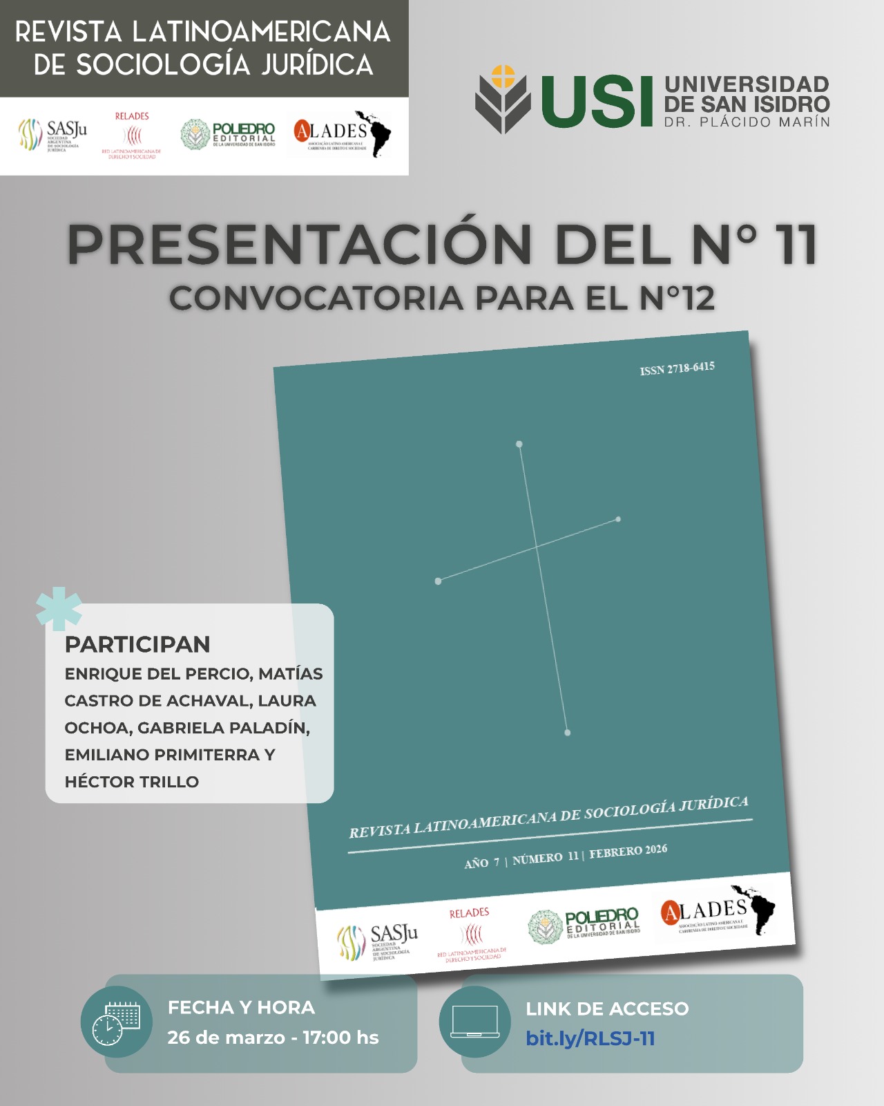 El próximo 26 de marzo a las 17:00hs. se realizará la presentación de un nuevo número de la Revista Latinoamericana de Sociología Jurídica, convocándose también a trabajos para una futura edición. Participarán Enrique del Percio, Matías Castro de Achával, Laura Ochoa, y autores de artículos publicados: Gabriela Paladín, Emiliano Primiterra y Héctor Trillo.