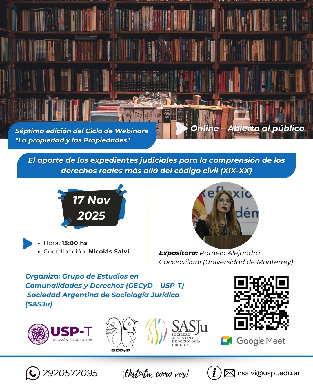 Organizado por el Grupo de Estudios en Comunidades y Derechos (GECYD-USP-T) y la SASJu, el próximo 17 de noviembre a las 17hs se llevará un nuevo encuentro del Ciclo de Webinars "La propiedad y las propiedades".